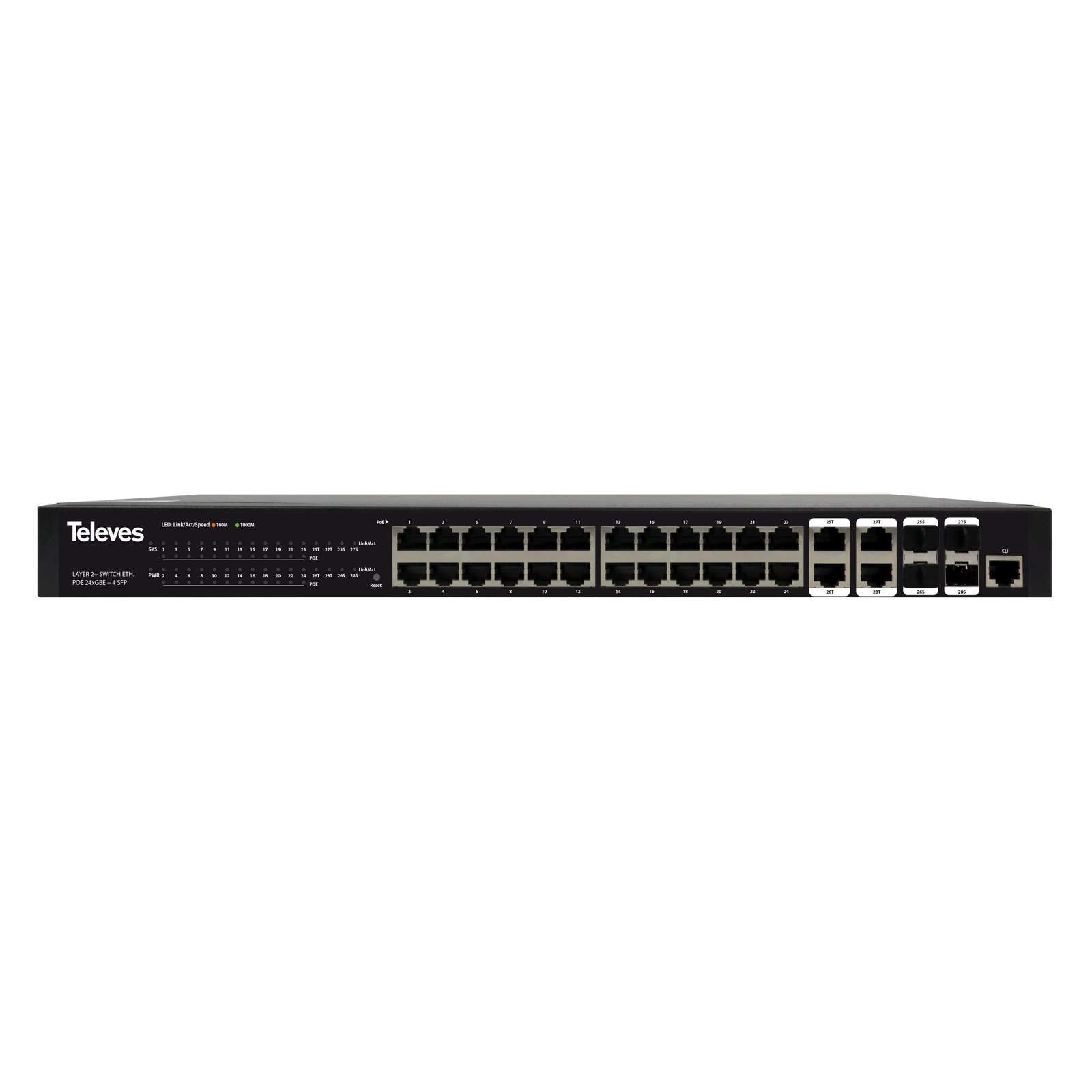 Der Switch verfügt über 24 PoE+ GbE-Ports mit einer Leistung von jeweils bis zu 30W sowie 4 Kombi GbE/SFP-Ports.