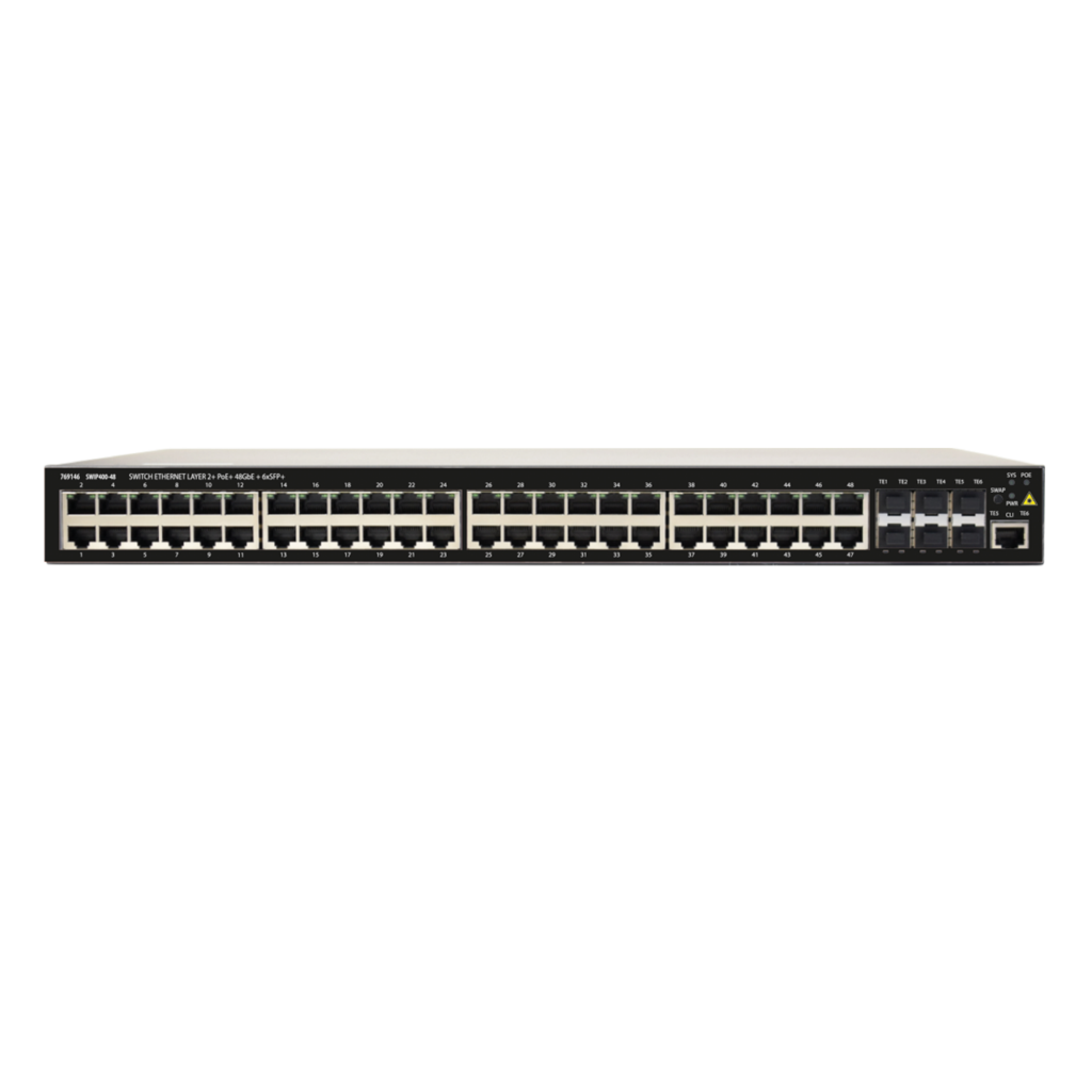 Der Switch verfügt über 48 PoE+ GbE-Ports mit einer Leistung von jeweils bis zu 30 W sowie 6 SFP+-Ports.