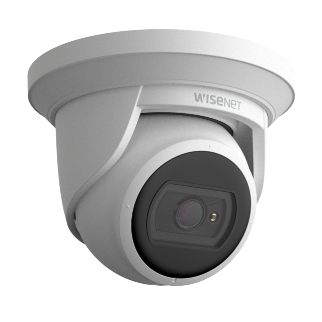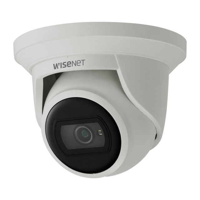 Wisenet A Series turret camera, 4MP @ 30 FPS, 3mm fixed focal lens, WiseStream II, Triple codec (H.265/H.264/MJPEG), 120dB WDR, IR LEDs 20m(65.62ft), day & night (ICR), FoV H: 98.3° / V: 54.2°, virtual area (intrusion/enter/exit), virtual Line (crossing/ direction), motion detection, tampering, hallway view, SD card, IP66, PoE, white.